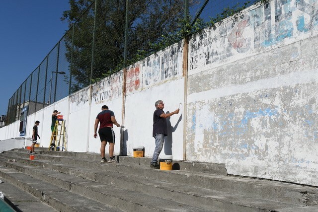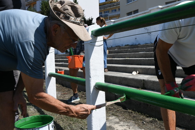Des dizaines de groupes de jeunes encadrés d’éducateurs et d’anciens se sont lancés dans des travaux de grattage, de nettoyage et pour finir de peinture des gradins, des murs et des mains courantes du stade.