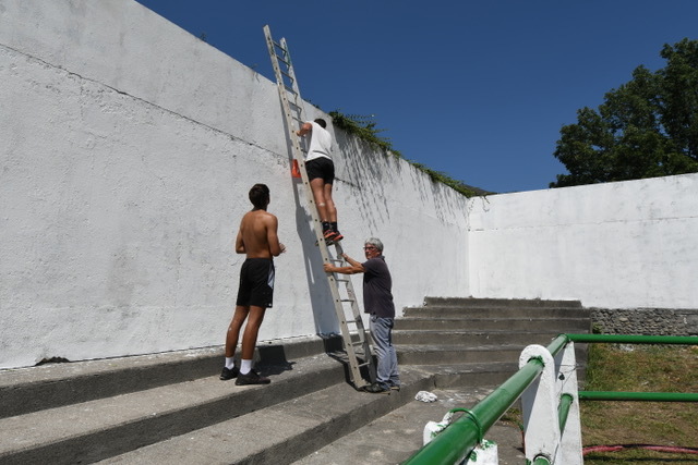 Des dizaines de groupes de jeunes encadrés d’éducateurs et d’anciens se sont lancés dans des travaux de grattage, de nettoyage et pour finir de peinture des gradins, des murs et des mains courantes du stade.
